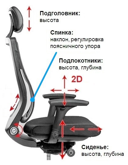 2D подлокотники регулируются по высоте и глубине для более удобной работы с клавиатурой компьютера.