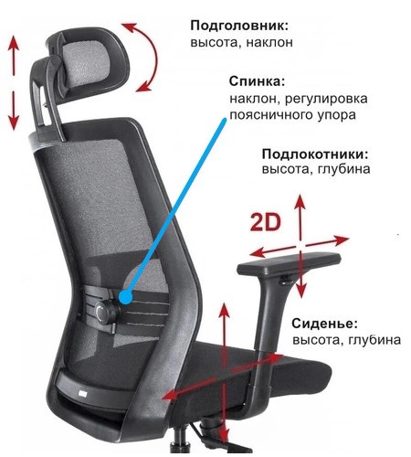 2D подлокотники с настройкой по высоте и глубине позволяют подобрать удобное положение рук при работе с клавиатурой компьютера.