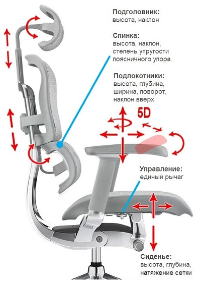 Уникальные 5D подлокотники обеспечивают удобное расположение рук и снижение нагрузки на мышцы плечевого пояса при работе на компьютере и во время других занятий — при использовании телефона, игре на консоли или чтении книги. Подлокотники, кроме обычных регулировок по высоте, ширине, глубине и углу поворота в горизонтальной плоскости, дополнены инновационной функцией сгибания передней части накладки. Верхняя площадка подлокотника разделена на две части, и передняя часть может сгибаться для поддержки предплечий. Увеличенные накладки из полиуретана — более толстые и мягкие — создают комфортную опору для локтей при использовании мобильных устройств.