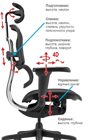 S-образная спинка кресла, повторяющая анатомическую форму спины человека, способствует снижению нагрузки на позвоночник. Конструкция состоит из двух частей. Верхний сегмент предназначен для поддержки грудного отдела позвоночника, а нижний — для поддержки поясницы. Спинка регулируется по высоте в диапазоне 65 мм с возможностью фиксации на 6 уровнях относительно сиденья.