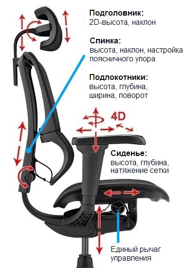 4D подлокотники обеспечивают удобное расположение рук при работе на компьютере и помогают уменьшить напряжение мышц плечевого пояса и предплечий. Подлокотники регулируются по высоте, ширине, глубине и углу поворота в горизонтальной плоскости.