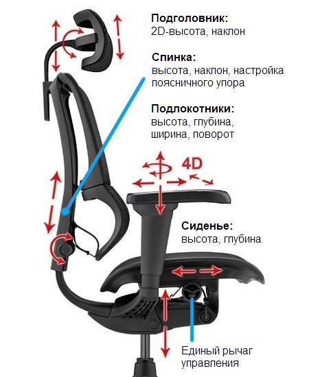 4D подлокотники обеспечивают удобное расположение рук при работе на компьютере и помогают уменьшить напряжение мышц плечевого пояса и предплечий. Подлокотники регулируются по высоте, ширине, глубине и углу поворота в горизонтальной плоскости.