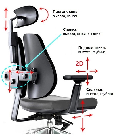 Спинка регулируется по высоте и ширине. Каждое крыло имеет отдельный винт регулировки и упруго-гибкое точечное крепление.