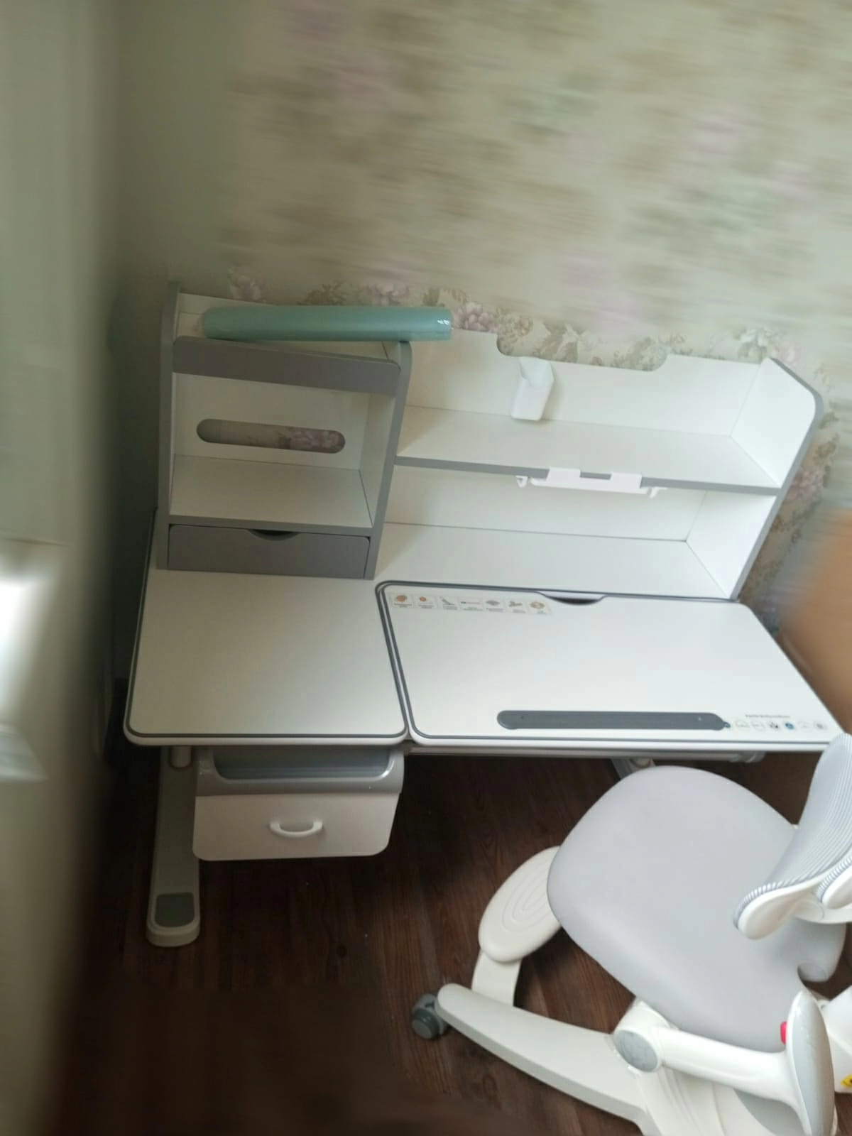 Столешница состоит из двух частей — стационарной L-образной зоны и рабочей поверхности с регулировкой угла наклона до 60°. Плавность регулировки обеспечивает качественный газлифт. Специальная выемка в верхней части рабочей поверхности делает процесс настройки угла наклона удобным и безопасным для рук ребенка.