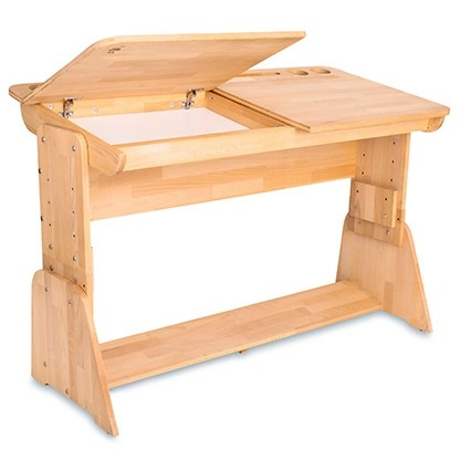 Парта выполнена из натурального дерева (бук) с экологически чистым покрытием (льняное масло или лак на водной основе). Все края закруглены, что исключает возможность травмирования ребенка.