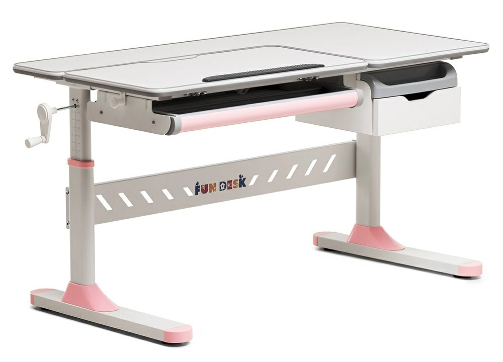Растущая парта FunDesk Fiore — это облегченная версия модели Fiore II, отличающаяся только отсутствием надстройки. Парта плавно настраивается по высоте с помощью ручки. Столешница состоит из двух частей — Г-образной стационарной зоны и рабочей поверхности, регулируемой по углу наклона от 0°до 50° при помощи газлифта. Барьер на переднем крае столешницы предотвращает соскальзывание листа бумаги или книжки при изменении угла наклона. Под столешницей размещен выдвижной органайзер и подвесная тумбочка с ящиком и выдвижным пеналом для канцелярских принадлежностей. Сбоку есть крючок для школьного рюкзака. Парта изготовлена из качественных и долговечных материалов. Столешница выполнена из МДФ, каркас — из стали. Опоры снабжены подпятниками для выравнивания стола на неровном полу.