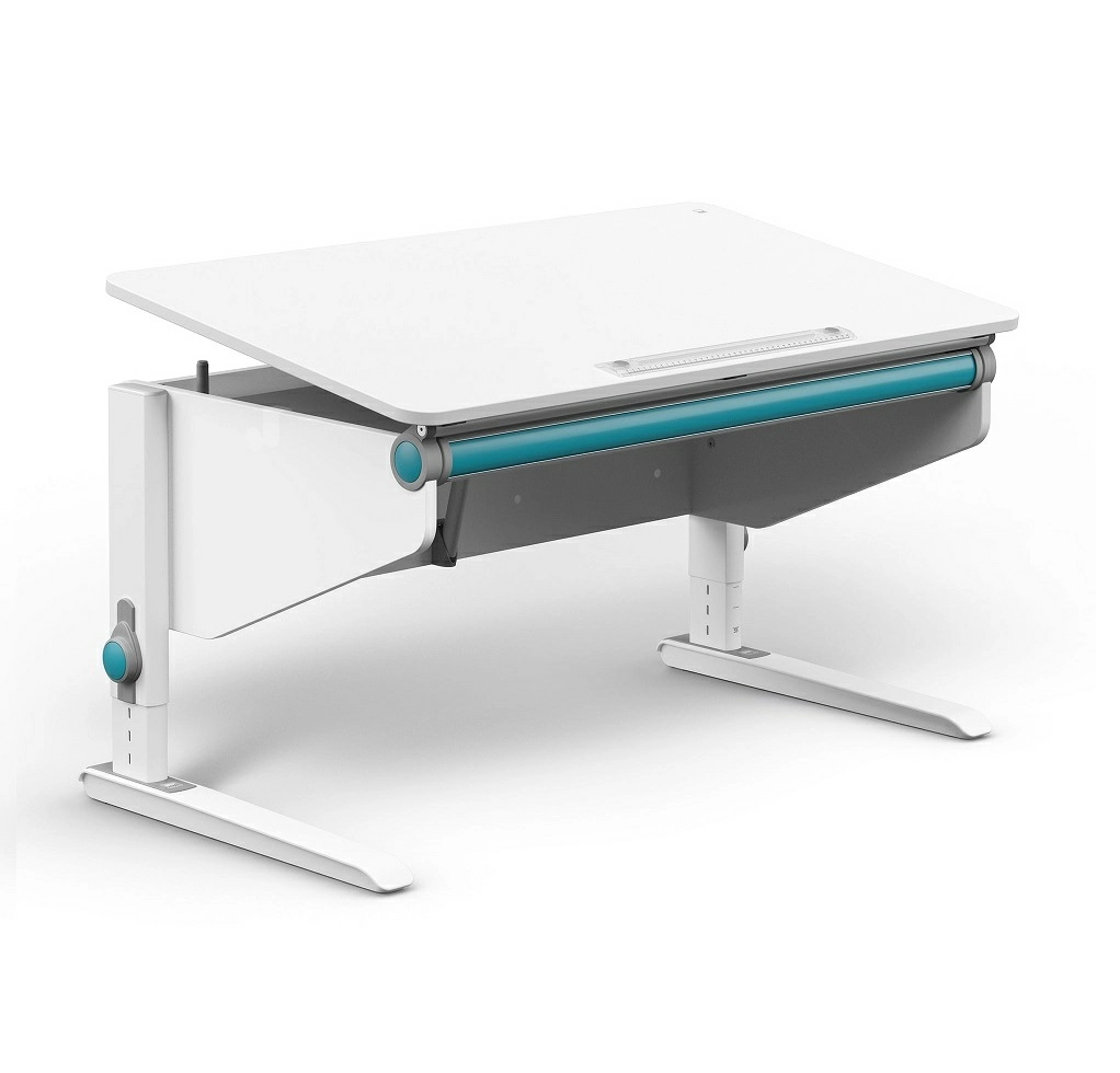 Бесступенчатая регулировка угла наклона столешницы от 0° до 18° с помощью запатентованного телескопического механизма дает возможность легко настроить рабочее место школьника для комфортного чтения, рисования и письма. Чтобы поднять столешницу, нужно потянуть ее на себя, а чтобы опустить, — потянуть за рукоятку, которая расположена под столешницей. Скорость опускания столешницы можно регулировать при помощи специального винта.