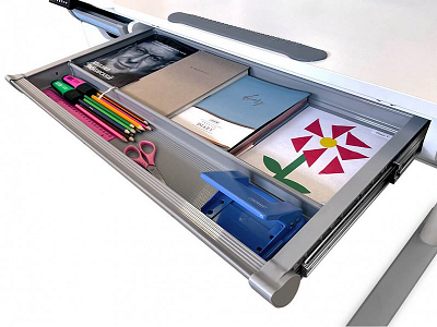 Под стационарной частью столешницы размещена подвесная тумбочка с выдвижным ящиком и пеналом для канцтоваров. Под рабочей зоной — вместительный выдвижной органайзер для альбомов, тетрадей и различных школьных принадлежностей.