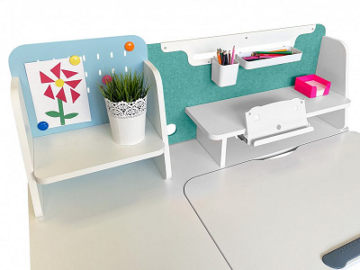 Парта дополнена практичной надстройкой с полочками для книг и учебников. Задняя панель надстройки состоит из двух частей — металлической и войлочной. К металлической стенке можно крепить записки и рисунки с помощью магнитов, а к войлочной — булавками или специальными шпильками.