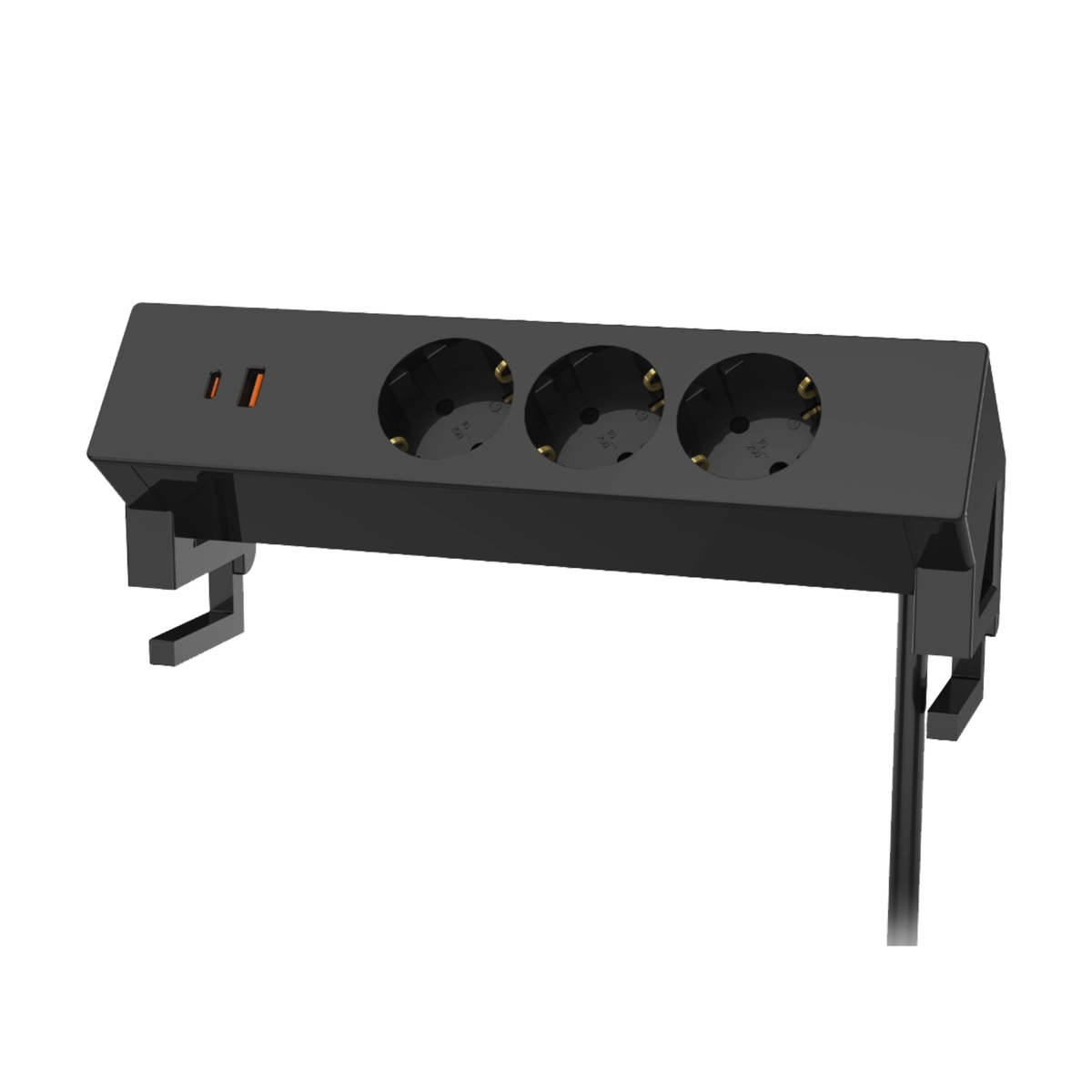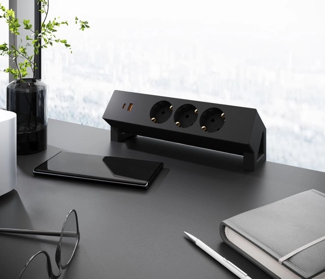Ergostol Clip — накладной блок розеток на зажимах, сочетающий в себе функциональность и стиль. Он идеально подходит для регулируемых столов, конференц-столов, компьютерных и других столов, где нужен удобный доступ к электричеству. Блок оснащен тремя EURO-розетками и 2 USB-портами (Type-A + Type-C) стандарта PD20W для быстрой зарядки гаджетов.