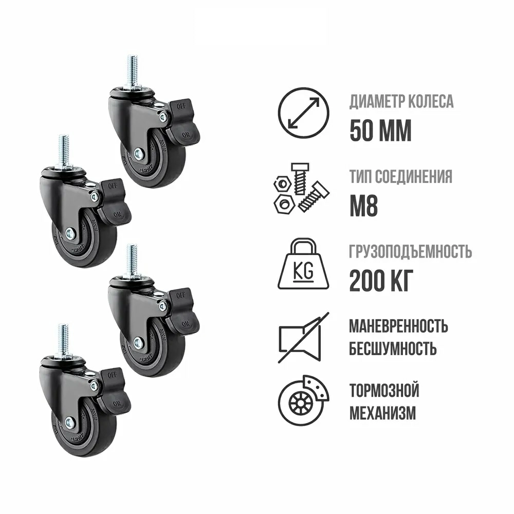 - Двухдюймовые колеса (диаметр 50 мм) с винтом типа М8