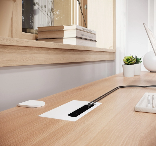 Прямоугольный пропуск для кабеля — практичный аксессуар, обеспечивающий эстетичный внешний вид рабочего места и надежную защиту проводов от пыли, перегибов и механических повреждений. Устанавливается в прямоугольное отверстие в столешнице. Откидная крышка позволяет легко получить доступ к проводам, а щеточный уплотнитель помогает скрыть свободное пространство и защищает от пыли.