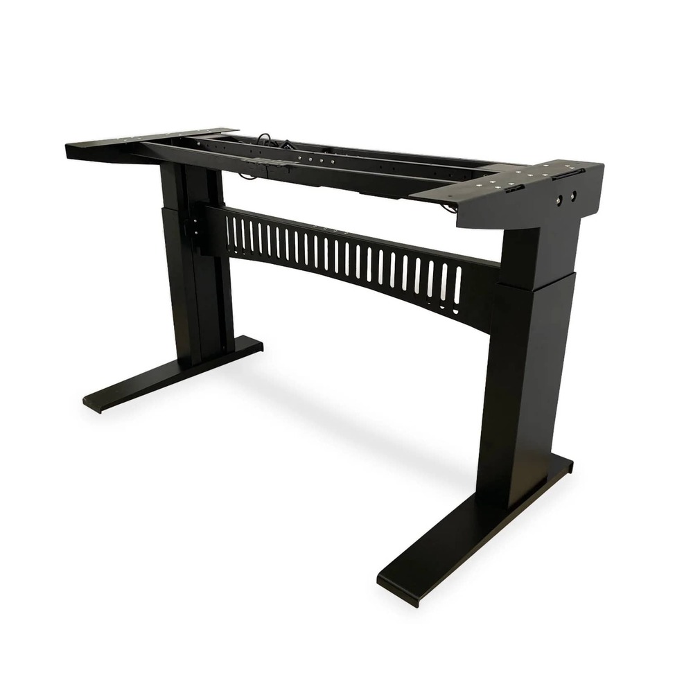 Массивные колонны выдерживают нагрузку до 250 кг, гарантируют надежность и устойчивость стола. Диапазон высоты — от 72 до 117 см без учета толщины столешницы. Ширина рамы регулируется от 134 до 214 см, позволяя установить столешницу шириной от 135 до 240 см. Визуально мощные стойки, широкие опоры и элегантный металлический экран придают столу солидный внешний вид, подчеркивая статуса владельца.