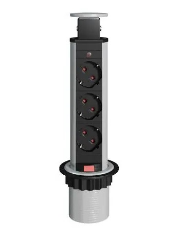 Компактный выдвижной блок розеток прост в эксплуатации и очень удобен для использования на небольших рабочих поверхностях. Он встраивается в столешницу и при необходимости легко поднимается вверх, не занимая много места на столе. Включает три розетки с заземлением. Крышка выполнена из крашеного пластика. Выдвижной блок можно устанавливать везде, где нужен порядок на рабочем столе — дома, в офисе, в отеле, на кухне и т.д.
